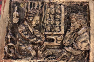 UN BASORELIEF SCULPTAT DE PROF: CRISTIAN PETRU BĂLAN PREZENTÂNDU-I PE CEI DOI TITANI ROMÂNI: MIHAI EMINESCU SAVURÂND O COMPZIȚIE MUZICALĂ COMPUSĂ ȘI INTERPRETATĂ LA PIAN DE PRIETENUL SĂU CIPRIAN PORUMBESCU