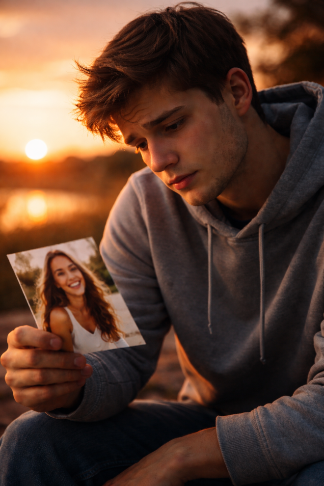Un tânăr ține poza iubitei într-o mână: