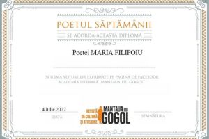 Diplomă – Maria Filipoiu OSTATICI ÎN TRANȘEE DE GLOANȚE (sonet eroilor) De veghe stau eroii în colț de cer, Așteptând norii cu ploi de speranțe Să ducă nedreptatea…
