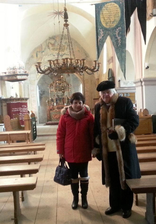 Părintele Eginald Schlattner și autoarea în biserica din Roșia/Rothberg